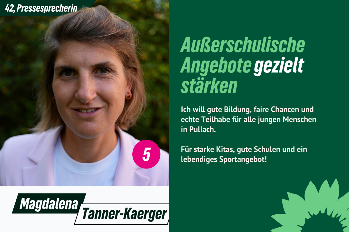 Pullach soll ein lebenswerter Ort für alle Generationen bleiben. Dafür arbeite ich gemeinsam mit den Grünen und unseren Bürgerinnen und Bürgern an einer zukunftsfähigen, klimafreundlichen und solidarischen Gemeinde. Ich lade Sie herzlich ein, sich zu informieren, mitzumachen und Pullach mit uns weiterzuentwickeln!
