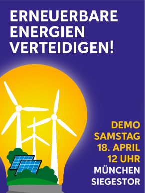 kommt zur Energiewende – Demo am 18.04. in München um 12 Uhr am Siegestor. Wir gehen gemeinsam auf die Straße, um ein Zeichen zu setzen: für die Energiewende, für Energiesicherheit, für regionale Wertschöpfung, für eine zukunftsfähige Energieversorgung – gegen fossile Lobbypolitik, gegen Krieg!