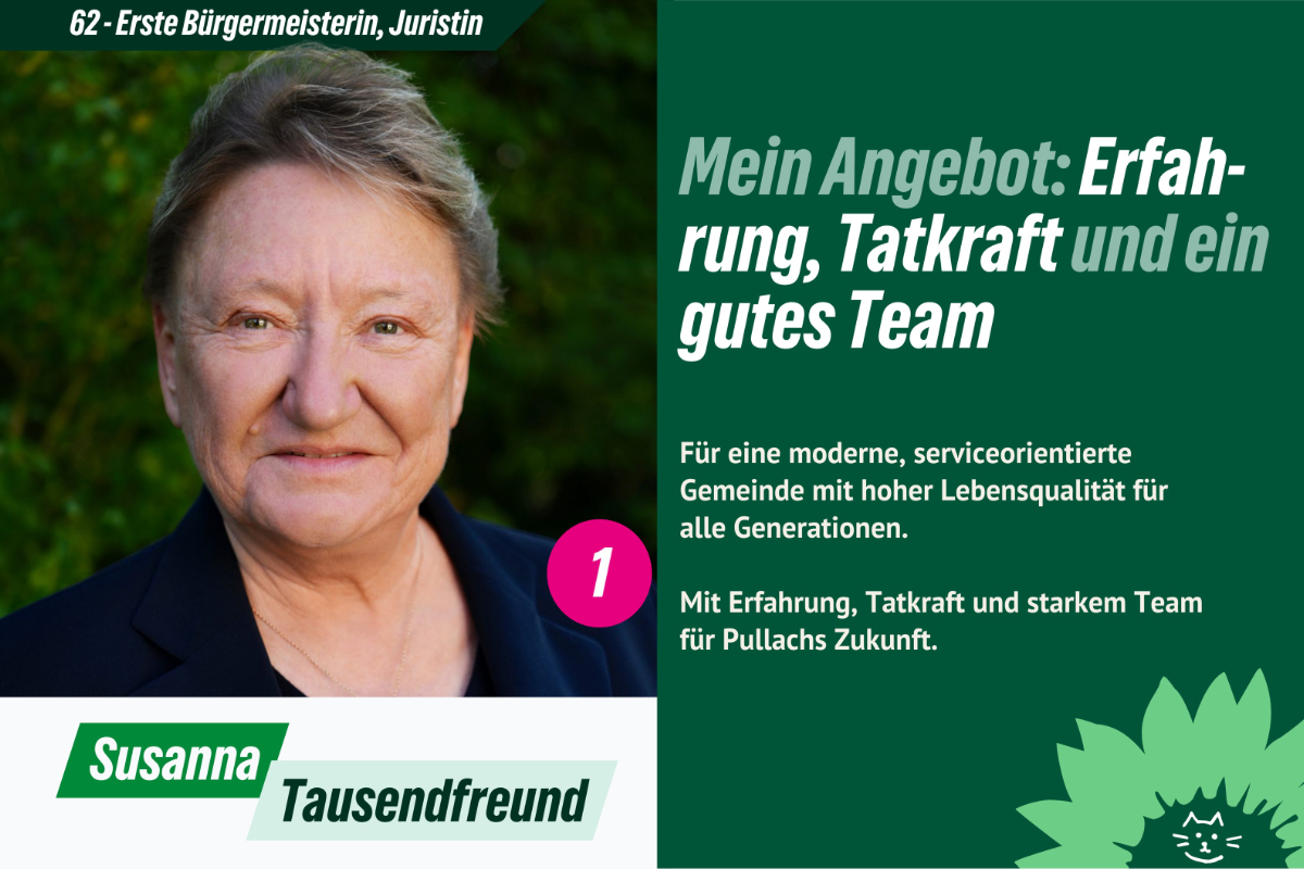 Pullach, 7. Oktober 2025. „Pullach ist meine Heimat und mein Herzensanliegen. Unsere Gemeinde weiter lebensnah, nachhaltig und zukunftsorientiert zu gestalten – dafür trete ich erneut als Bürgermeister-Kandidatin an“, so Susanna Tausendfreund. Die amtierende Bürgermeisterin von Pullach, die sich um eine dritte Amtszeit bewirbt, freute sich über die einstimmige Wahl zur Bürgermeisterkandidatin. Auch 10 Frauen und 10 Männer, die Verantwortung im Gemeinderat der Gemeinde Pullach übernehmen möchten, wurden mit großer Mehrheit auf die grüne Liste gewählt. ...
